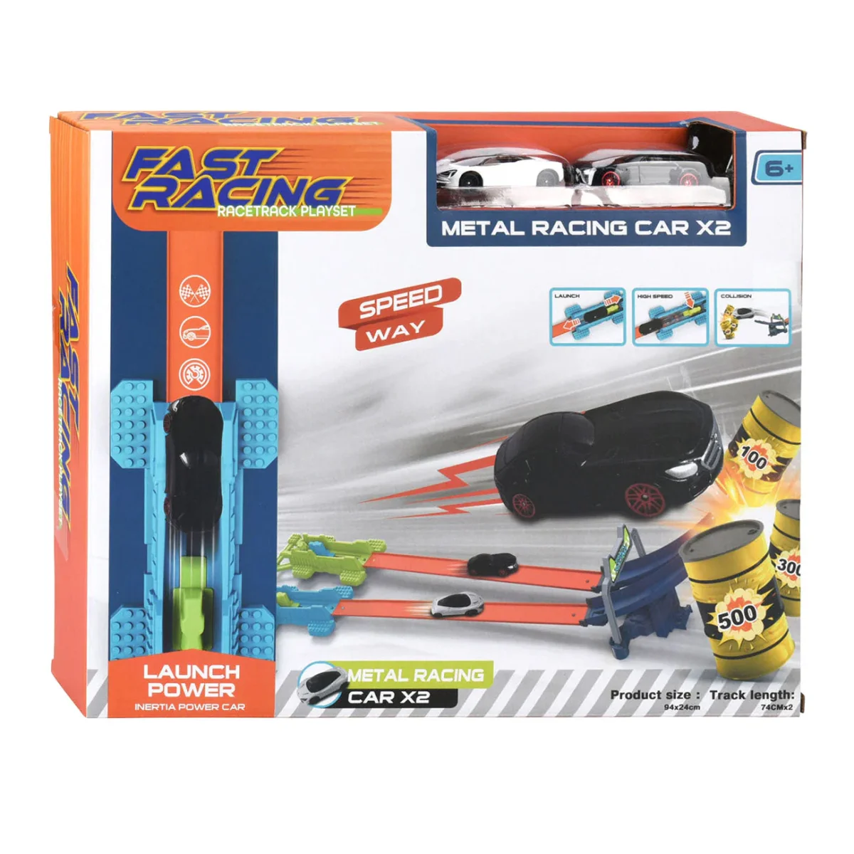 Racebaan speelset met twee racetracks naast elkaar, 2 metalen auto’s en 3 olievaten met punten om omver te rijden.