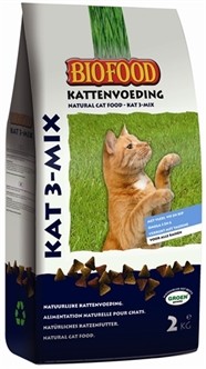 BIOFOOD kat 3-mix kattenvoeding is met grote zorg bereid met natuurlijk geselecteerde ingrediënten. BIOFOOD kat 3-mix bevat de optimale dagelijkse hoeveelheid eiwitten, vetten, koolhydraten, vitaminen en mineralen die bijdragen tot een goede gezondheid van uw kat. De bronnen van eiwitten, koolhydraten en vetten zijn van hoge kwaliteit. Deze zorgen voor een betere vertering en ontlasting. Het hoge vleesaandeel zorgt voor een perfecte opname en prima acceptatie. Het gehalte aan minerale grondstoffen is laag, waardoor de zuurgraad in de urine eveneens laag blijft, wat zorgt voor een goede blaasfunctie. Daarnaast is BIOFOOD kat 3-mix voeding verrijkt met taurine en gezonde omega 3 en 6 vetzuren. BIOFOOD kat 3-mix kattenvoeding is een natuurlijke, smaakvolle, gezonde en complete voeding voor uw kat.