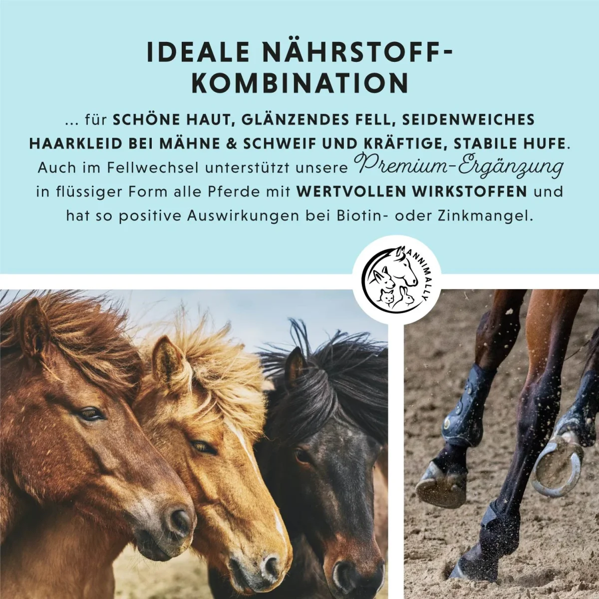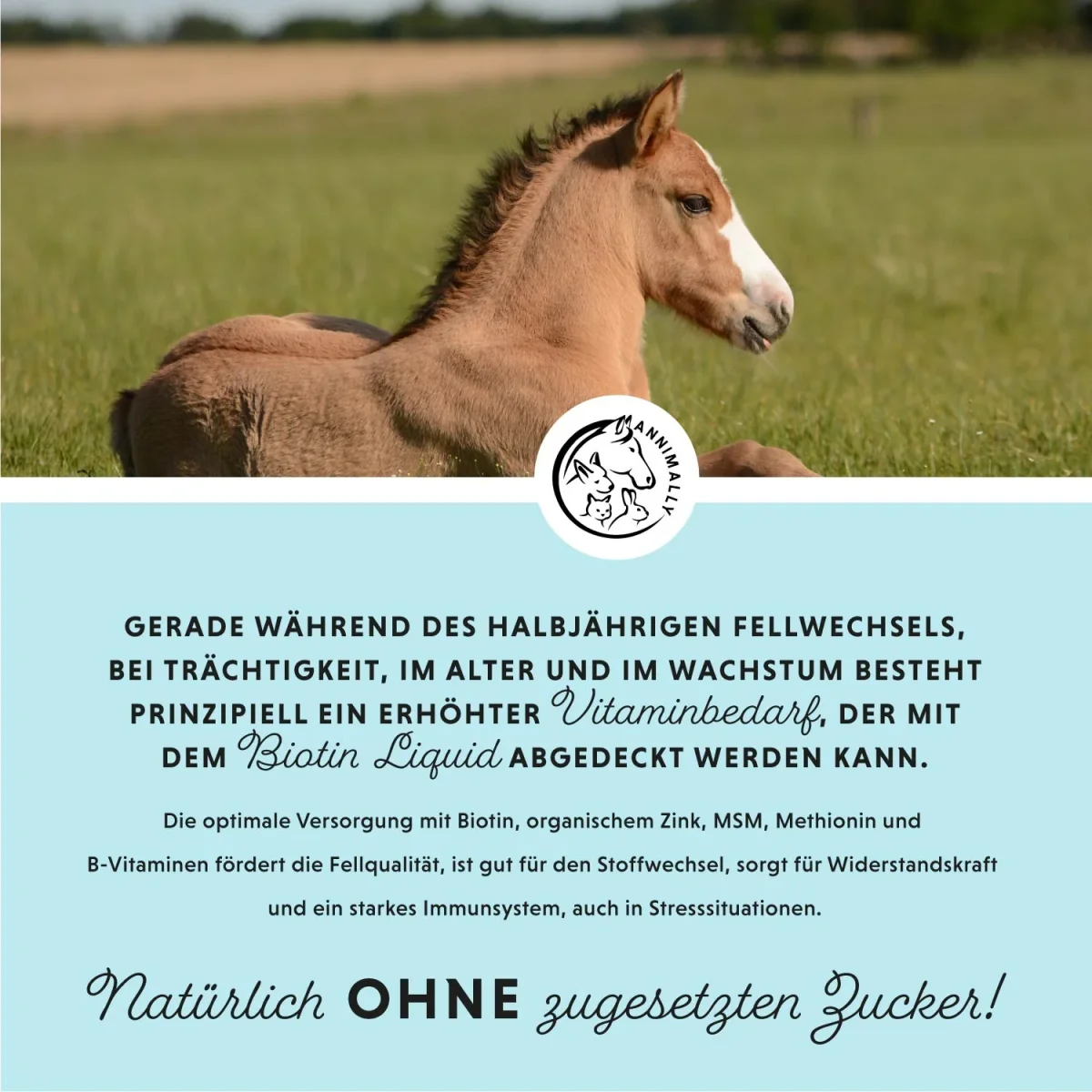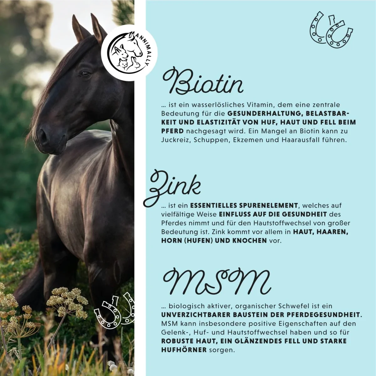 - ALLROUNDER VOOR PAARDEN: Biotine wordt beschouwd als het beste middel voor een gezonde huid, glanzende vacht, zijdezachte manen en stabiele, sterke hoeven.