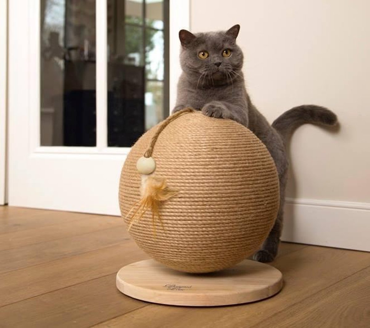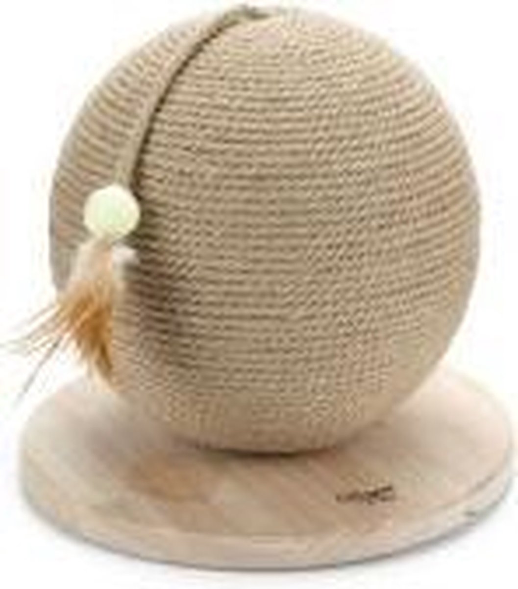 De bol staat op een mooie naturel ronde bodemplaat. Aan de bovenkant zit een touwtje met een veer en balletje. Door het speelse ontwerp is dit net even weer wat anders dan een gewone krabpaal. Toch heb je zo iets leuks om je kat een plezier mee te doen. De bal wordt vooral gebruikt voor kittens.