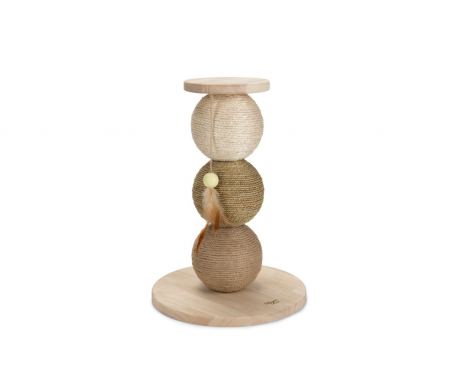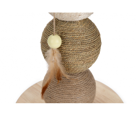 De drie bollen waar je kat aan kan krabben hebben elk hun eigen soort natuurlijk materiaal. Gevlochten zeegras, jute en sisal hebben elk hun eigen kleur. Aan de bovenkant hangt een klein touwtje met daaraan een speels veertje en een pastel geel balletje. Zo kan je kitten naast krabben ook nog spelen.
