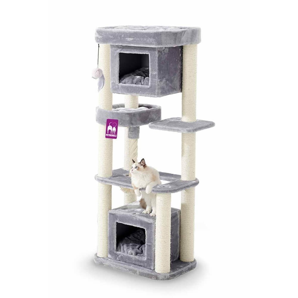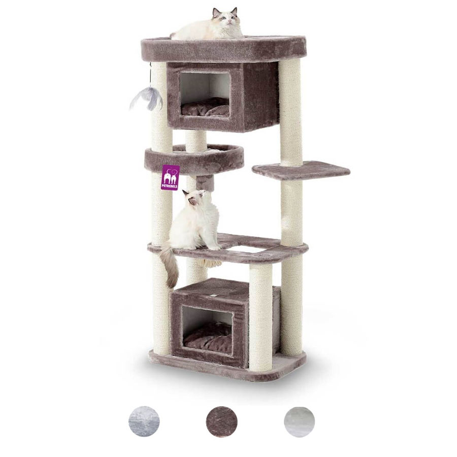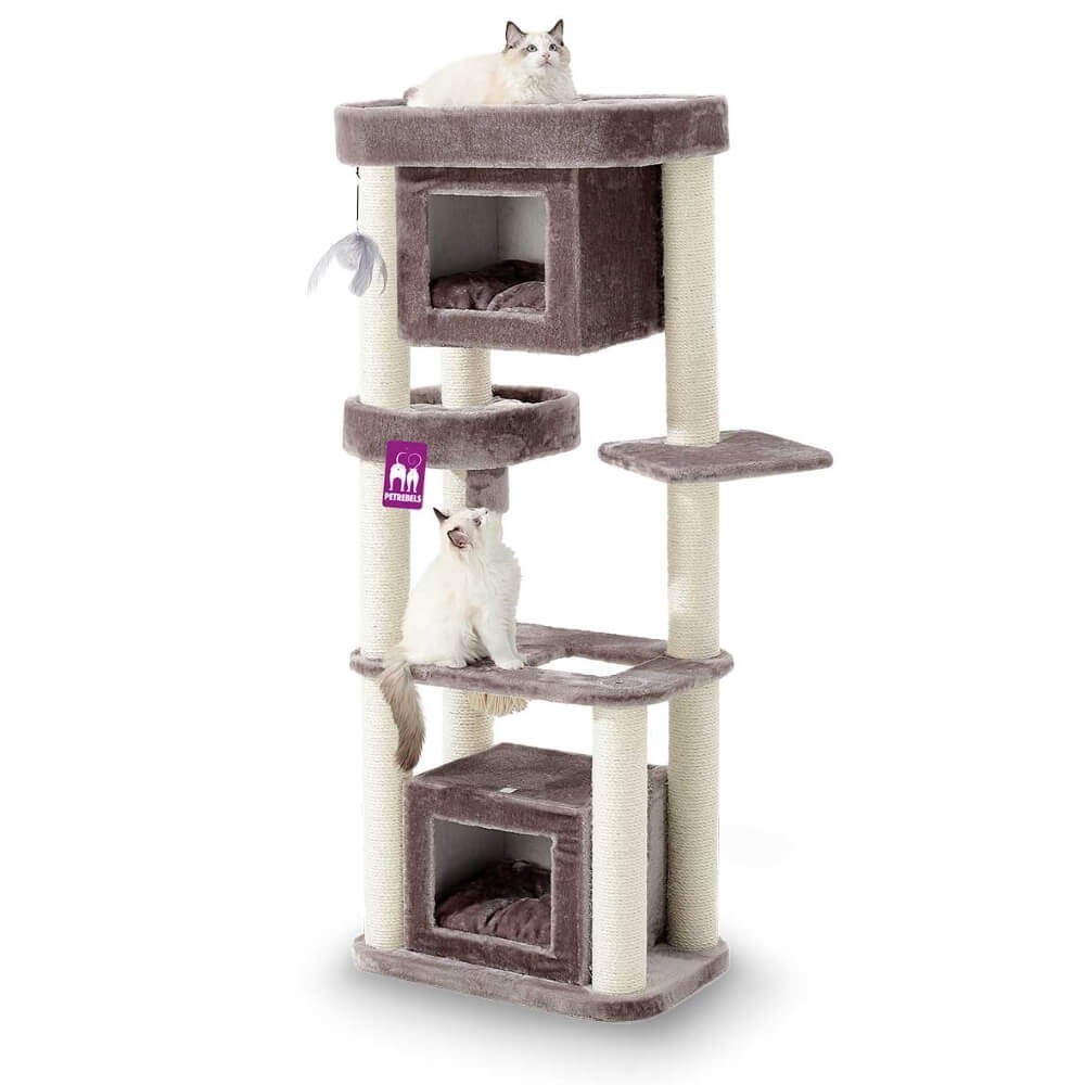 Katten zitten graag op hoge plekken, want dan kunnen ze alles en iedereen goed in de gaten houden. Maar dat geldt niet voor elke kat. De kleintjes en senioren zijn liever laag bij de grond, want dat is beter bereikbaar. Onze Villa 150 is van alle markten thuis – want hij is geschikt voor elk type kat met een slaaphuisje onderin én bovenin. En die zijn comfortabel hoor, want in elk slaaphuisje ligt een fluweelzacht kussen. Net als in de super-de-luxe loungemand bovenin. Uitgeslapen? Dan kan je kat heerlijk krabben aan de extra dikke krabstammen.
