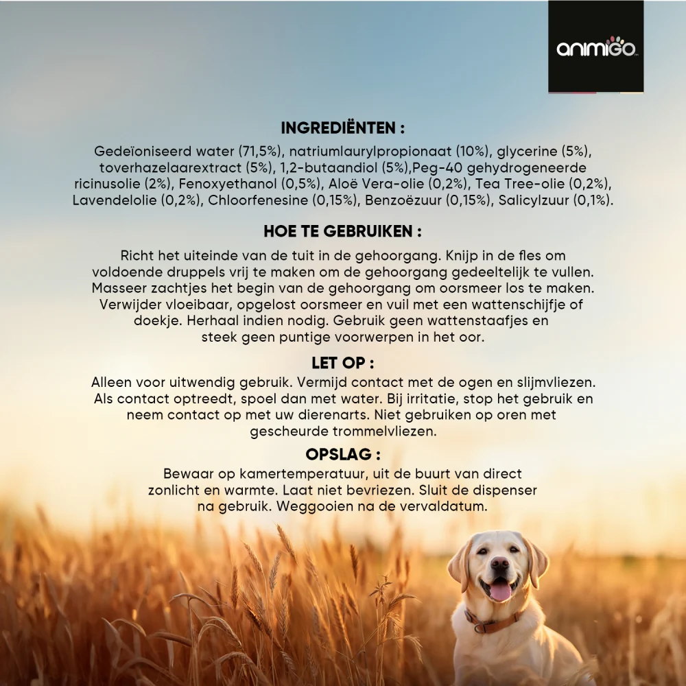 Richt de punt van de tuit in het oor van je huisdier en knijp voorzichtig in de fles om voldoende druppels te laten vallen om de gehoorgang gedeeltelijk te vullen. Masseer zachtjes de basis van de gehoorgang om oorsmeer los te maken en verwijder alle vloeibare, opgeloste vuil met een watje of zakdoek. Herhaal het gebruik indien nodig, ofwel regelmatig om de oren schoon te houden of wanneer ze verstopt raken. Alleen voor plaatselijk gebruik. Vermijd contact met ogen en slijmvliezen. Spoel bij contact direct af met water. Als irritatie optreedt, stop dan met het gebruik en neem contact op met je dierenarts. Niet gebruiken op oren met gescheurde trommelvliezen.