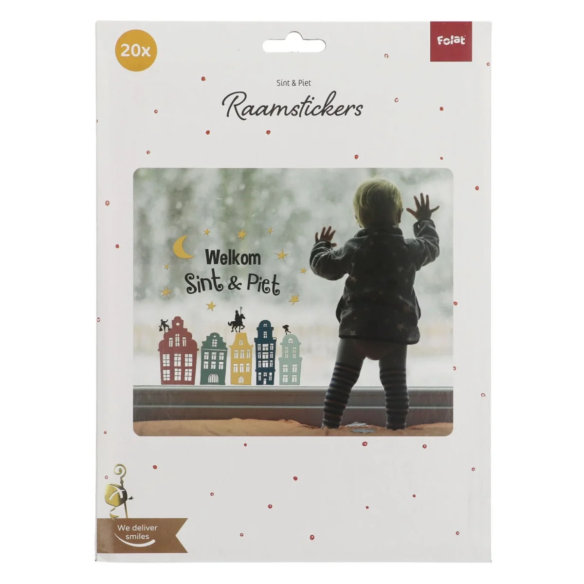 Raamstickers ‘Welkom Sint & Piet’. Inhoud: 20 raamstickers. Er zitten 5 stickervellen in een verpakking. De stickers zijn herbruikbaar en gemaakt van PVC.