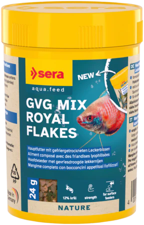 GVG Mix Royal Flakes is het hoofdvoeder met lekkernijen voor siervissen die de neiging hebben zich aan de oppervlakte te voeden en bevat geen kleur- en conserveermiddelen.