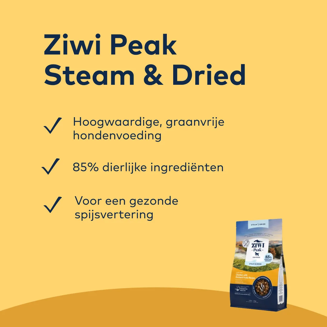 Sport je dus regelmatig met je hond of rent hij alleen een paar uur per dag hard? Voer je hond dan bijvoorbeeld deze Ziwi Dog Steam/Dried kip . Gemaakt van spier- en orgaanvlees. Aangevuld met fruit, erwten en linzen.